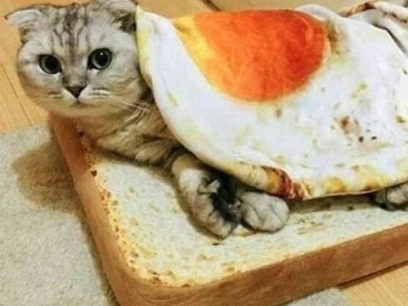 Bathed in afternoon sun, Whiskers lounged on a pillow shaped like a slice of bread, looking like a warm, purring loaf. Her humans laughed at the sight as she purred in bliss. On her bread-shaped throne, she was the queen of comfort and simple joy.