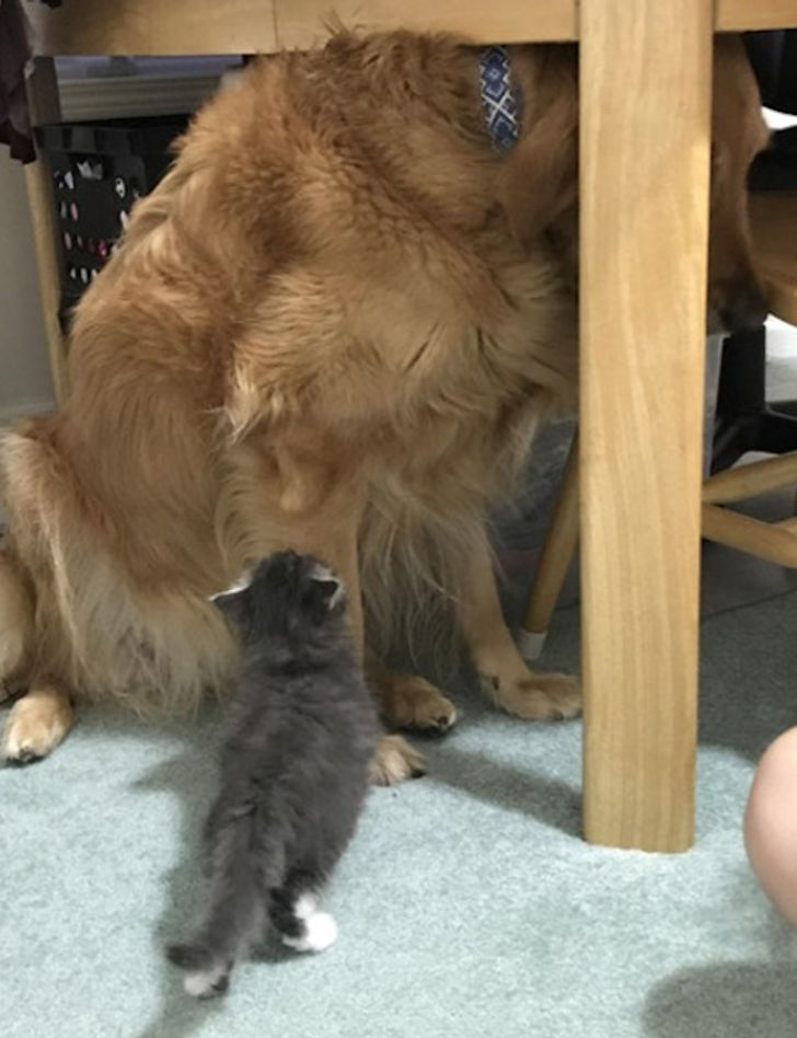 Despite the huge size difference, the tiny kitten has become the boss of the house, to everyone’s amusement. This funny role reversal shows that courage and attitude often matter more than size, and animals never cease to surprise us with their bold personalities.