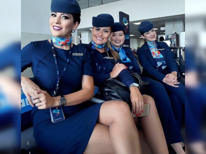 Poised flight attendants await their next journey. This photograph likely shows a team at the airport, perhaps near a gate. In crisp uniforms with stylish accents like scarves or hats, they project professionalism and calm. A relaxed pre boarding moment reveals camaraderie, from easy smiles to casual conversation. Airport scenes — passengers, departure boards, planes beyond tall windows — frame the story. The image reminds us that behind each uniform is a person, and that teamwork and warmth define the role as much as appearance.