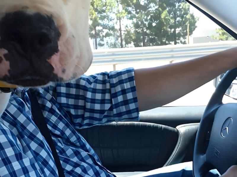 Either this dog is learning to drive, or he is chauffeuring his human to work. What other talents does he have? His look is on point, and his outfit matches his eyes. This is the face we all make when stuck in traffic.