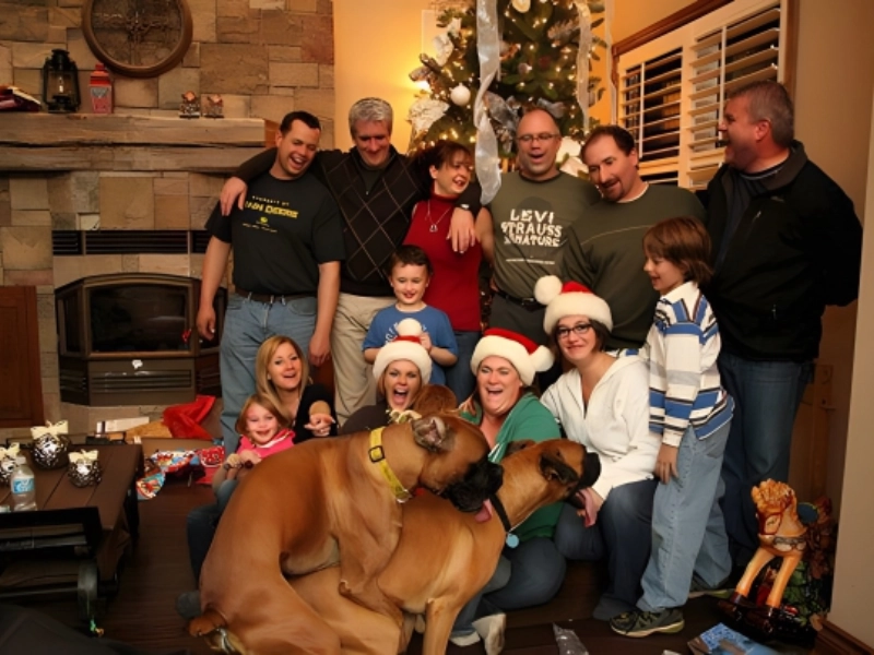This awkward family holiday photo features two dogs who took the Christmas spirit a bit too far. Maybe they got their gifts early. No one stopped them, they just wanted to keep the party going. At least their antics sparked genuine smiles from their humans. Sometimes the mood takes over and you just go with it.
