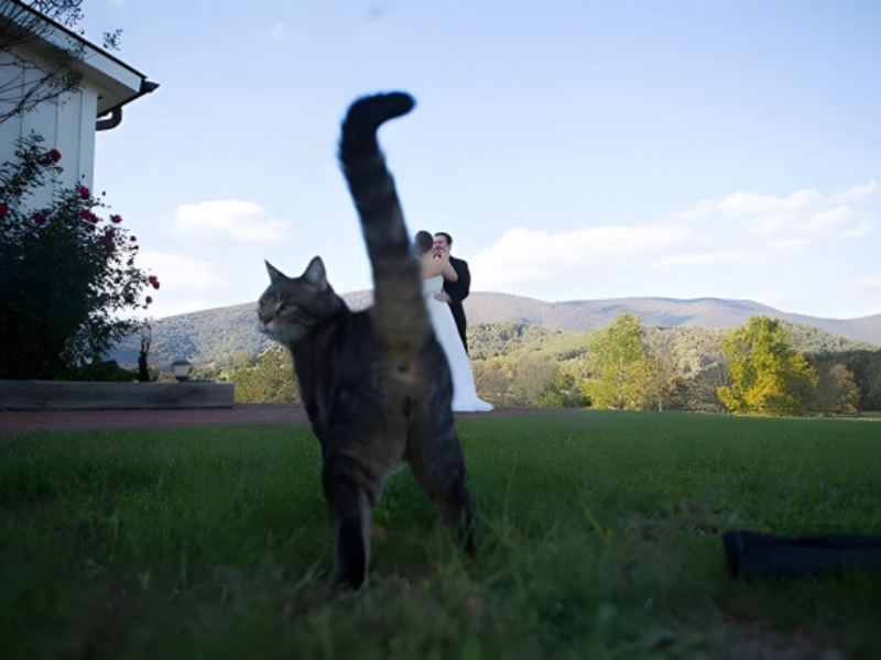 Oops. This photo is a bit cheeky. Cats love to show off their rears to trusted humans. Here, the cat seems to be making a statement about the wedding. Maybe she is giving the newlyweds a hint about what to expect. This is exactly why we adore cats, their boldness makes every moment memorable.