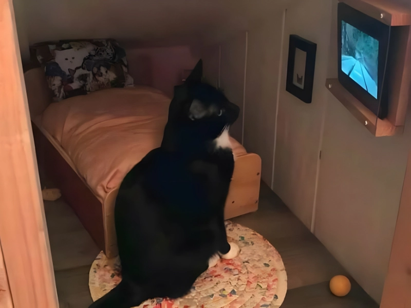 This adorable cat has a private nook under the stairs, like Harry Potter’s room but far more luxurious. The space features a round rug, a playful ball, a tiny picture frame, and a cozy bed with a matching cat-themed cushion. The best part is a television.