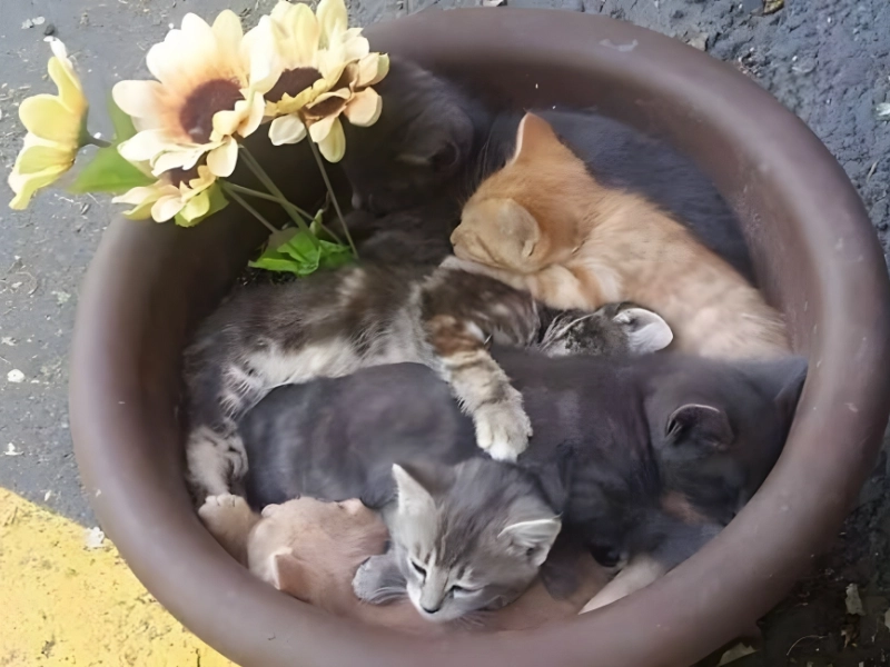 Every cat owner knows the moment when a cat appears, yawning in the most unexpected place. This playful photo shows a pot filled with curled-up cats, capturing that delightful surprise.
