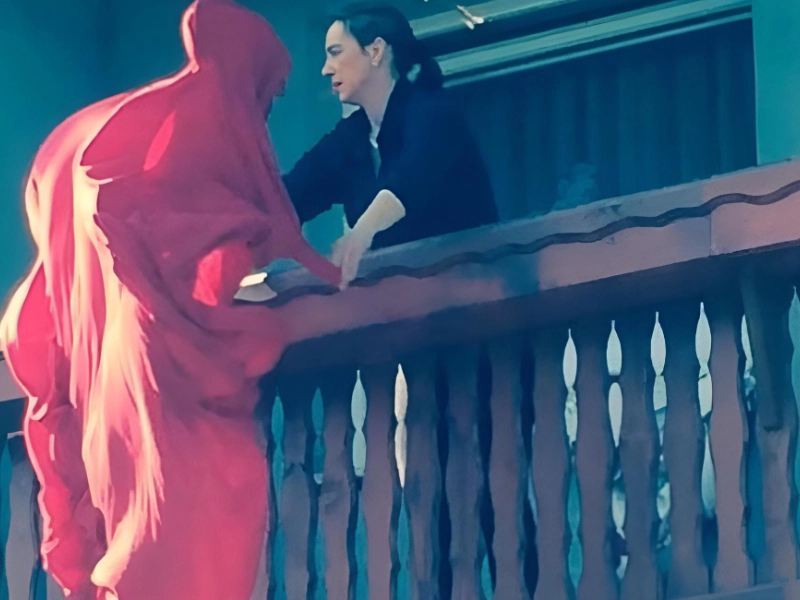 Without context, you might think she is speaking to a spirit or part of something occult. The phantom shape and her calm face blur reality and the supernatural, inviting viewers to imagine their own tale.