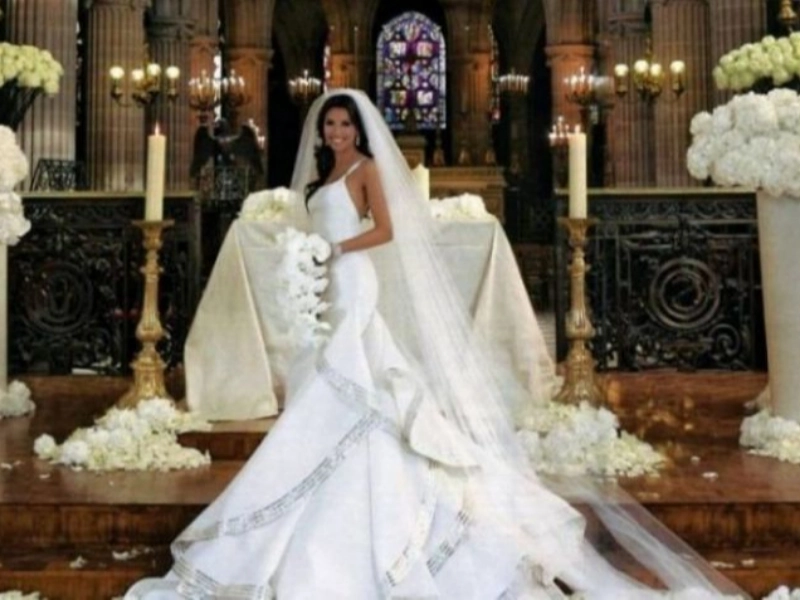 Eva Longoria chose an Angel Sanchez gown crafted from sumptuous organza and silk. Defined by refined elegance, it featured a fluid silhouette and meticulous craftsmanship. Her choice became a symbol of Hollywood polish, inspiring brides who seek grace with a modern edge.